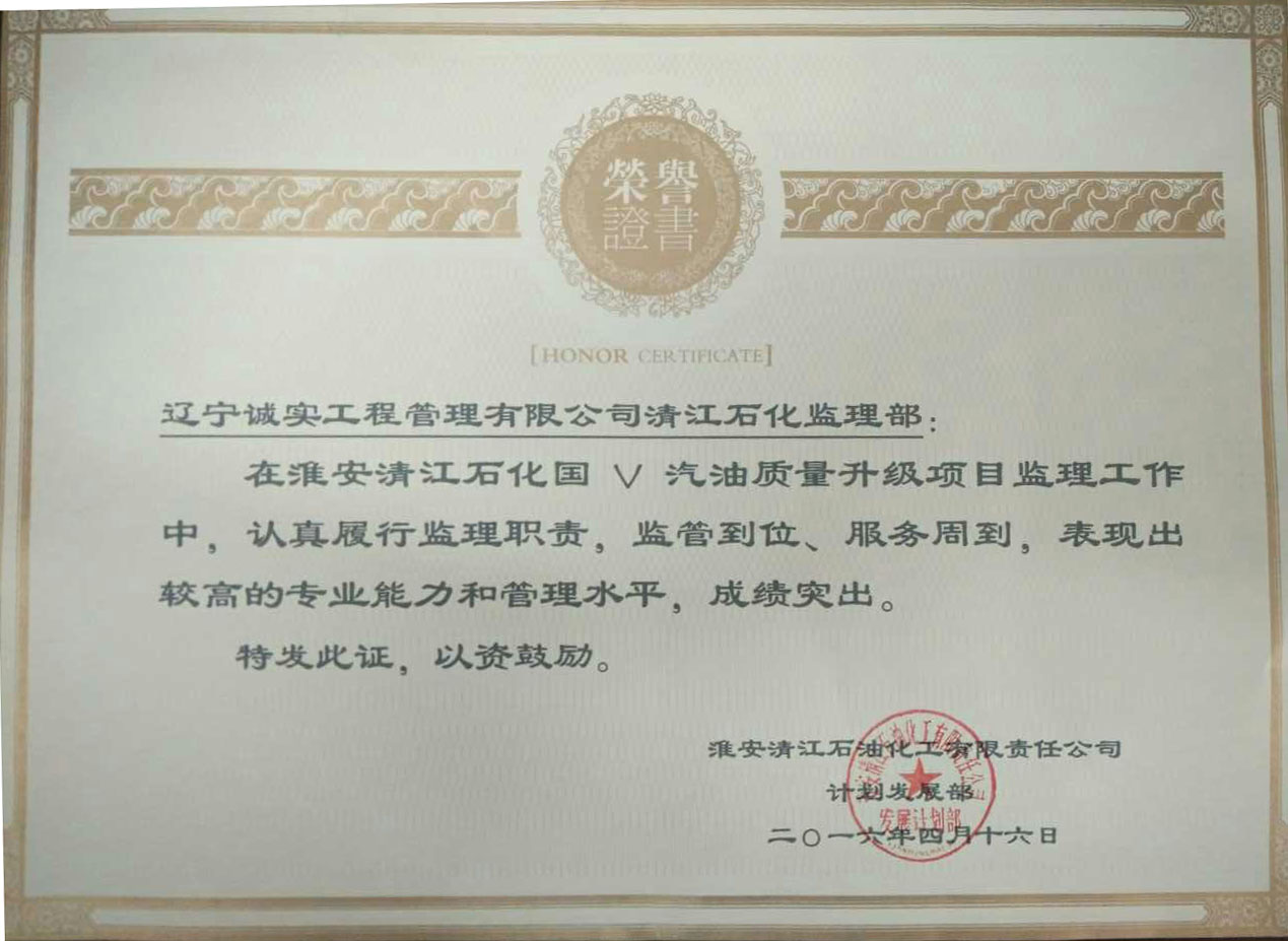 我公司監(jiān)理人員在“中石化淮安清江石油化工有限責(zé)任公司國(guó)Ⅴ汽油質(zhì)量升級(jí)項(xiàng)目”工程監(jiān)理服務(wù)工作中,得到了建設(shè)單位的一致認(rèn)可和肯定,對(duì)我們的工作表示十分滿(mǎn)意,特發(fā)函提出表?yè)P(yáng),并贈(zèng)與榮譽(yù)證書(shū)、錦旗以資鼓勵(lì)。