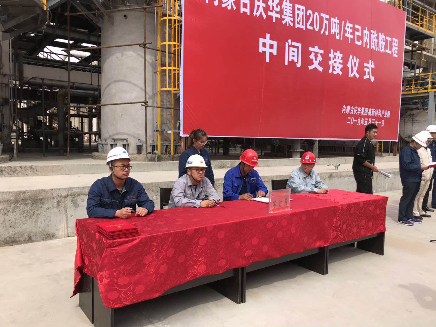 5月31日上午10:00內蒙古慶華集團20萬噸/年己內酰胺工程進行了中間交接,遼寧誠實騰格里項目部總監孫典在交接儀式上進行了簽字。交接的部分裝置有:精制、肟化、硫銨車間。