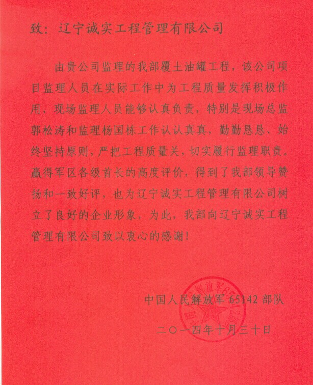 信中,中國人民解放軍65142部隊對我公司及項目監理人員表示衷心的感謝。我公司項目監理人員能夠認真負責地工作,切實履行監理職責,并且對該項目的總監理工程師郭松濤同志與工程師楊國棟同志提出了表揚。為此軍區各級首長給予了高度評價,得到了65142部隊領導的贊揚和一致好評!